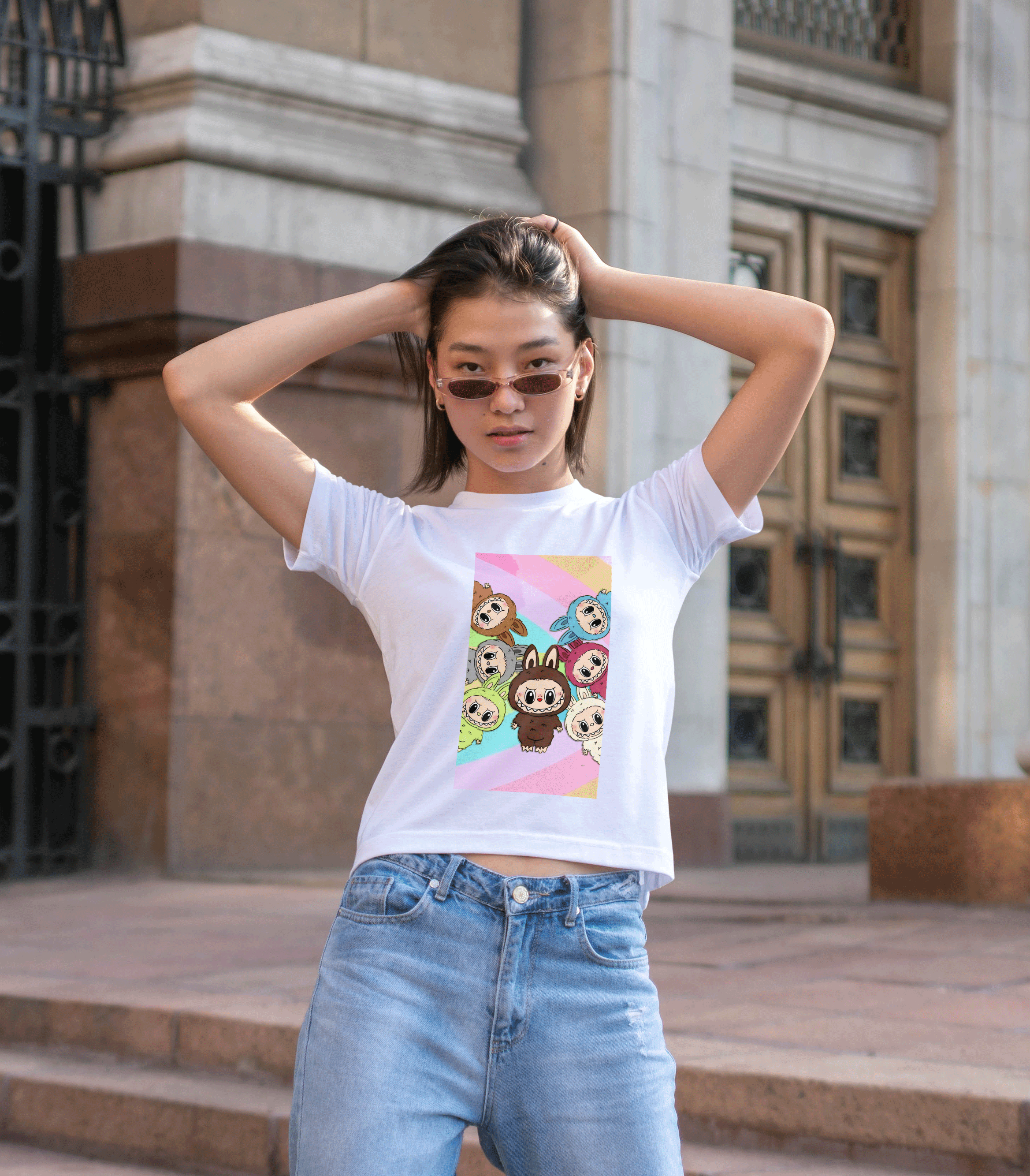 The front features a vibrant, high-resolution print of Labubu and friends in a colorful and playful design that instantly catches attention. Whether you're styling it for anime events, mall hangouts, or cozy weekends, this shirt combines fun, fashion, and quality in one.